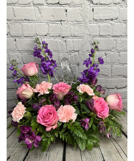 Angel in the Garden, is a graceful floral arrangement designed to bring comfort, beauty, and a touch of heavenly charm to any space. At its center rests a sparkling crystal angel, symbolizing peace and protection, surrounded by a lush garden of soft pink and purple blooms. A heartfelt expression of love, hope, and serenity, Angel in the Garden is a timeless keepsake arrangement that continues to shine long after the flowers have bloomed.