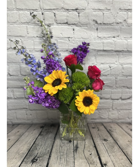 This fun and vibrant vase arrangement features sunny sunflowers, vibrant hot pink roses, purple stock, blue delphinium, and green trick! You can upgrade this arrangement by including one of our Tyler candles!