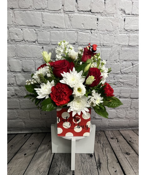 A precious arrangement featuring roses, lisianthus, carnations, and more, in the most adorable "Cute as a Bug" container!