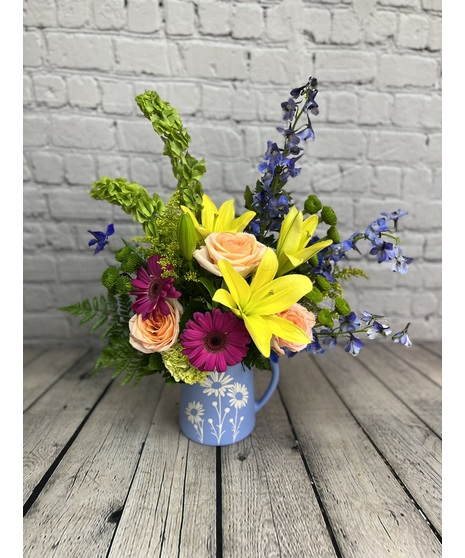 Brimming with fresh-picked charm, Teleflora's Daisy Dreams Bouquet delights with peach roses, yellow lilies, and other cheerful blooms arranged in a food-safe blue pitcher adorned with a sweet white daisy design.