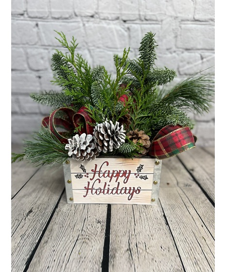 Bring the spirit of the season into any space with Evergreen Cheer. This festive arrangement is designed with lush Christmas greens, natural pinecones, and beautifully tied holiday ribbons—each element carefully arranged to celebrate the warmth of the holidays. Presented in a rustic wooden crate stamped with “Happy Holidays,” this piece adds the perfect touch of woodland charm to entryways, tabletops, or gift deliveries.