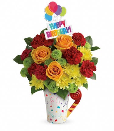 A celebration in a mug! Make a special day even more memorable with this bright, beautiful gift. Radiant orange roses and rich red carnations burst with happiness from a festive mug they'll love sipping from for years to come!