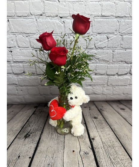This arrangement features three stunning red roses arranged beautifully in a delicate bud vase. What makes this gift extra special is the adorable bear gently hugging the vase, adding a playful and cozy touch to your gesture.