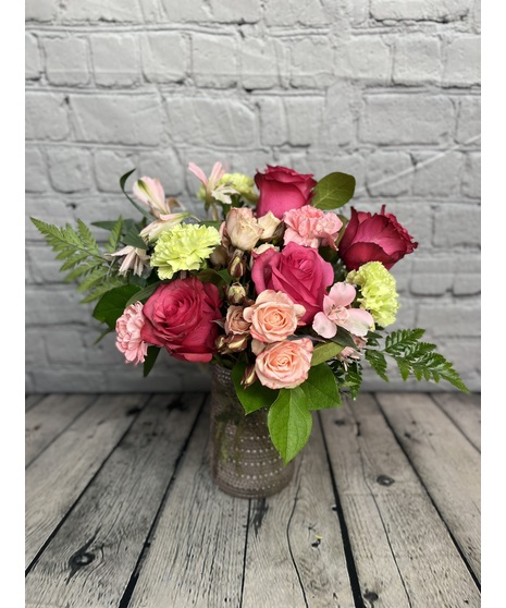 Delight Mom with Teleflora's Sparkling Joy Bouquet, delivered in a pink glass carafe with elegant beaded details. This keepsake meets FDA tableware standards to safely serve and store drinks, adding beauty to any table year-round.