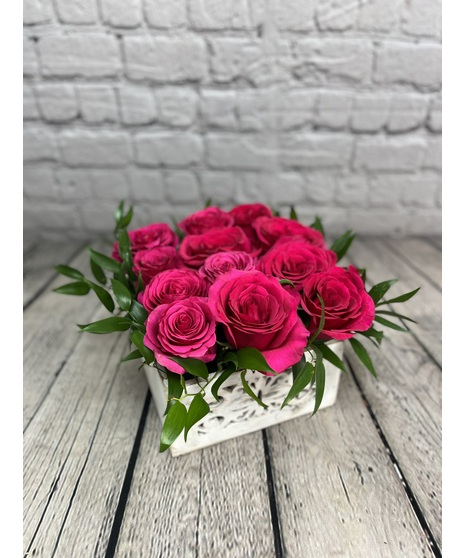 The Rose Box features a stunning dozen hot pink roses carefully selected for their freshness and elegance, nestled in a handcrafted white wooden box. You also have the option of upgrading your arrangement by pairing it with one of our popular Tyler candles!