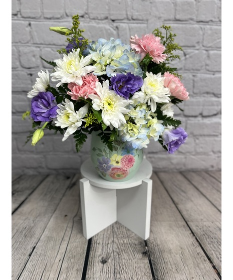 Teleflora's Watercolor Garden Bouquet is a cheerful Mother's Day flower arrangement of pink, purple, and blue blooms, beautifully presented in Teleflora's Watercolor Garden Vase keepsake-perfect for celebrating Mom with fresh spring style. You also have the option of upgrading this arrangement with a popular Tyler candle! **CANDLE COLOR/SCENT WILL VARY**