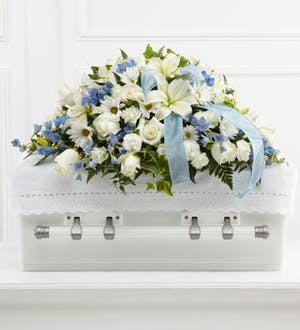 White roses, daisies, monte casino asters, Asiatic lilies, and mini carnations are accented with light blue delphinium and a light blue organza ribbon to be displayed on top of the casket at their final farewell service.